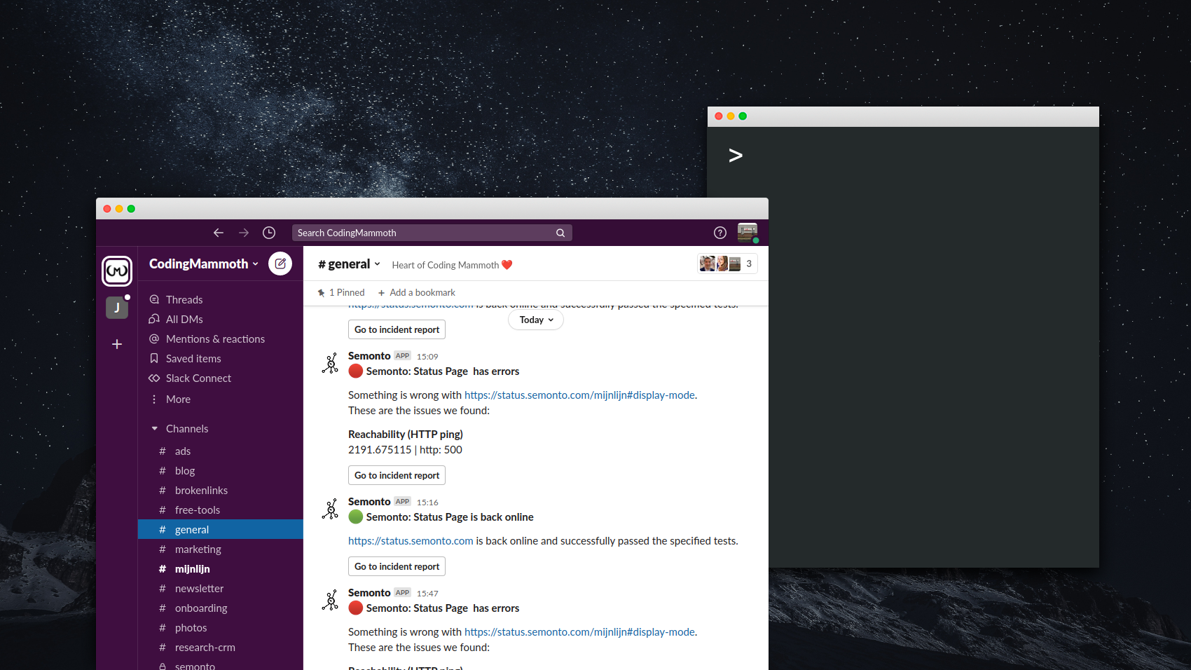 When your website is in trouble, you want to know as fast as possible. In addition to e-mail notifications, SMS text messages, phone voice messages, push notifications and tweets, you can now also get Slack notifications when something is wrong with your website or server.