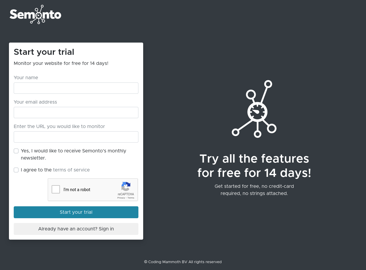 Enter your name, your e-mail address, and the URL of the website you would like to monitor. Don't forget to start the URL with https://. Agree to the terms of service, prove that you are not a robot, let us know whether you want to subscribe to our newsletter, and you are good to go!
