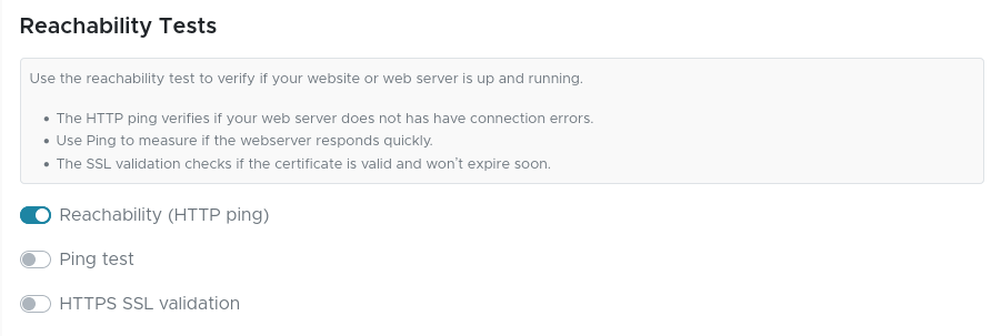 When you go to Monitors and click on a URL, you can select ‘Configure reachability tests’, where you can edit the settings. Some settings have been entered by default so that you do not need to change anything to start monitoring. However, you are free to adapt them to your needs.