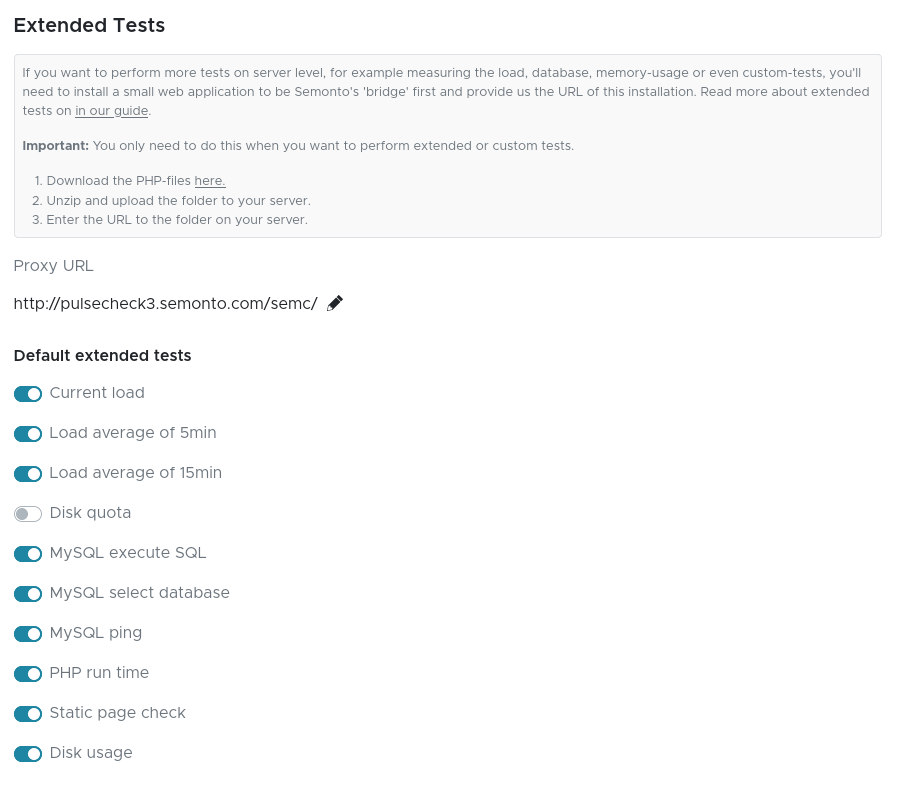 When you would like to perform extended or custom tests, you need to supply a URL to the ‘bridge’ for Semonto to be able to find and perform those tests. This is because Semonto does not has access to your server settings or database configuration for example. This is for security reasons. If you want to monitor your database or want to keep an eye on the server-load, you will need to install a small web application on your server, the 'bridge'. This allows Semonto to access the needed data, without having too much access.