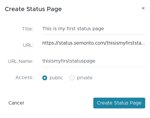 Creating a Status Page with Semonto is really easy. Just go to the Status Page tab in Semonto and click the create button. Then you can provide a title and a matching URL will be generated. If this URL is already taken, Semonto will warn you. You can adjust the URL if needed.