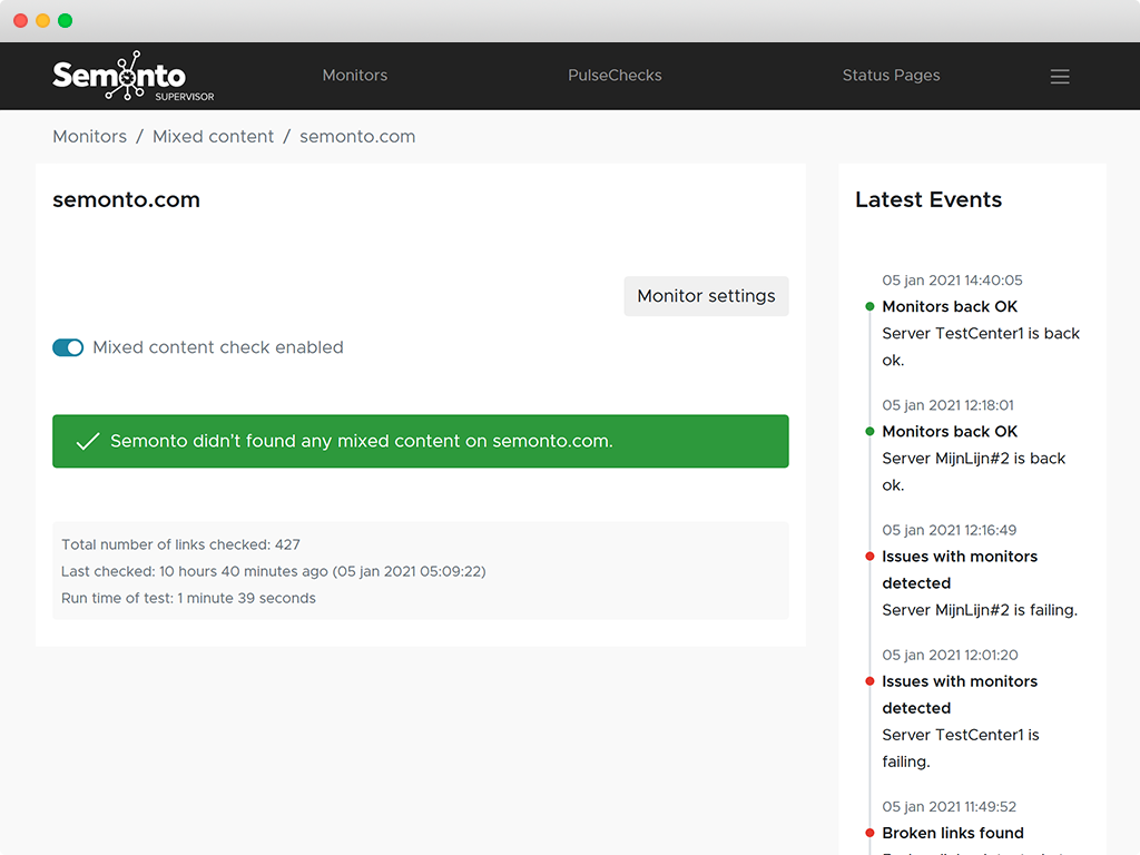 Mixed content is one of the lesser-known threats to your security. When you pull images or files from a non-secure source (over an HTTP connection), the protection provided by your HTTPS certificate gets compromised. Semonto will inform you when that happens so that you can restore the security level before any harm is done.